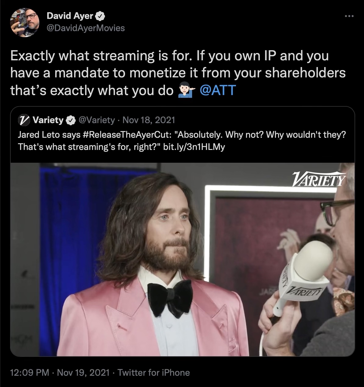 Jared Leto says #ReleaseTheAyerCut: "Absolutely. Why not? Why wouldn't they? That's what streaming's for, right?" https://t.co/zxbXC1Mklo pic.twitter.com/QLMVtysfaf